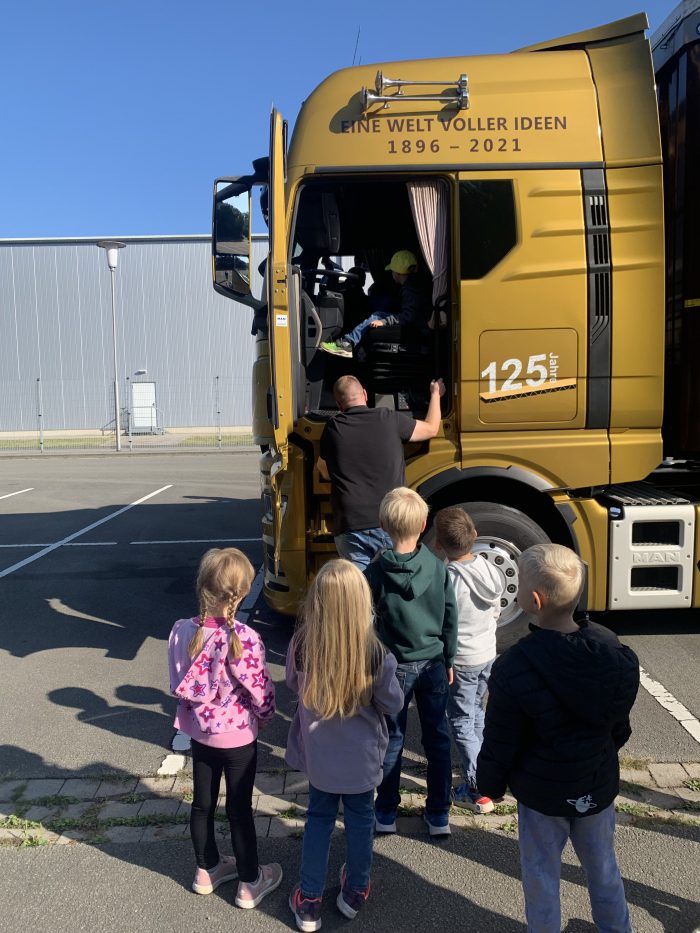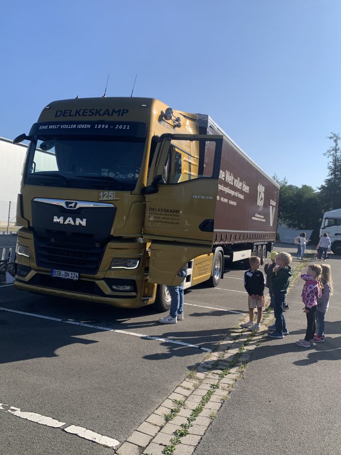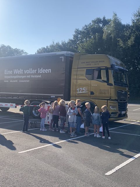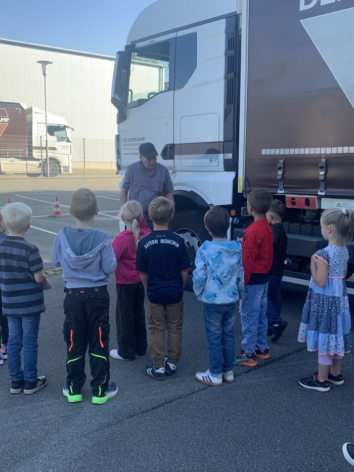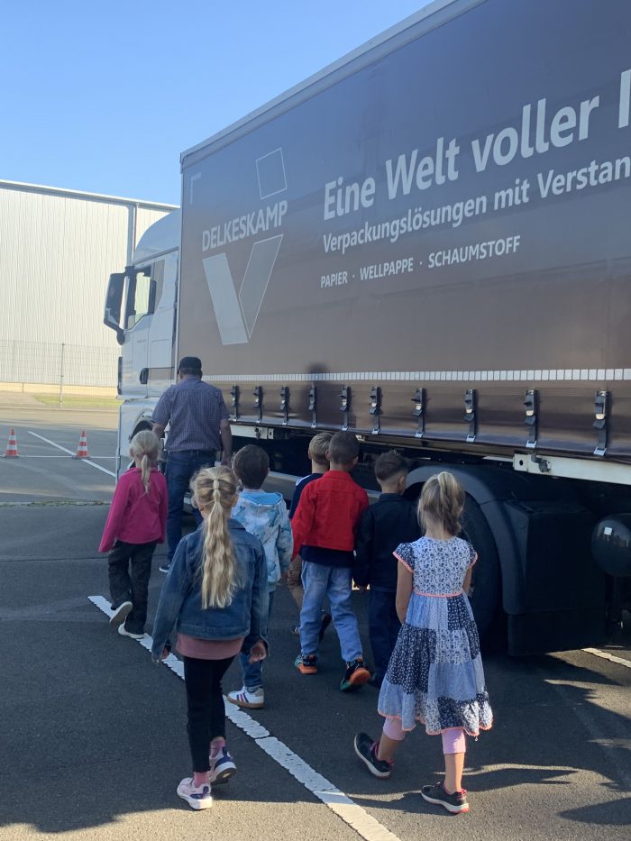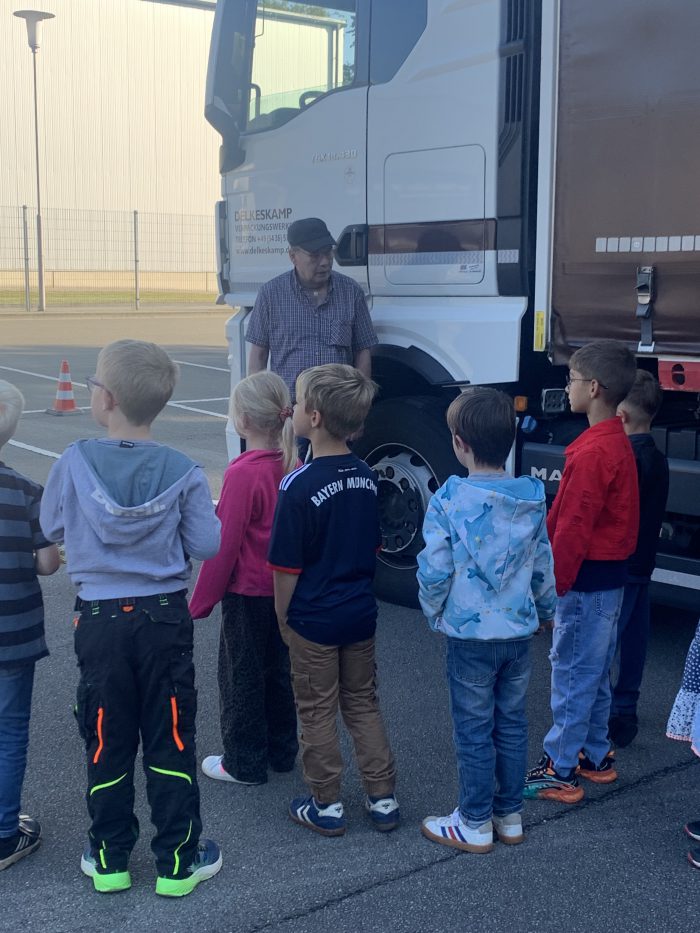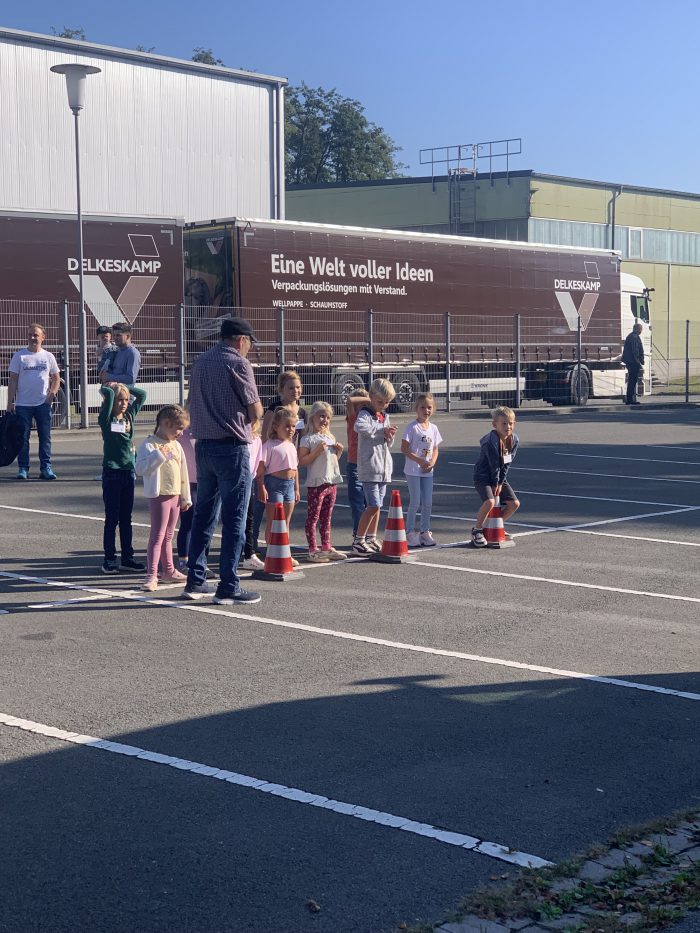 Anfang September war unser Jahrgang 1 bei der Verkehrsschulung der Firma Delkeskamp. Hier wurde den Kindern in Begleitung ihrer Eltern gezeigt, wie sie sich im Verkehr richtig verhalten. Vor allem ging es darum, dass die Kinder ein Gefühl dafür bekommen, wie eingeschränkt die Sicht von LKW Fahrern auf Radfahrer ist und wie sie sich bemerkbar machen können. Die Kinder lernten in Gruppen an verschiedenen Stationen. Dabei durften sie sogar selbst einmal in einem LKW mitfahren.
