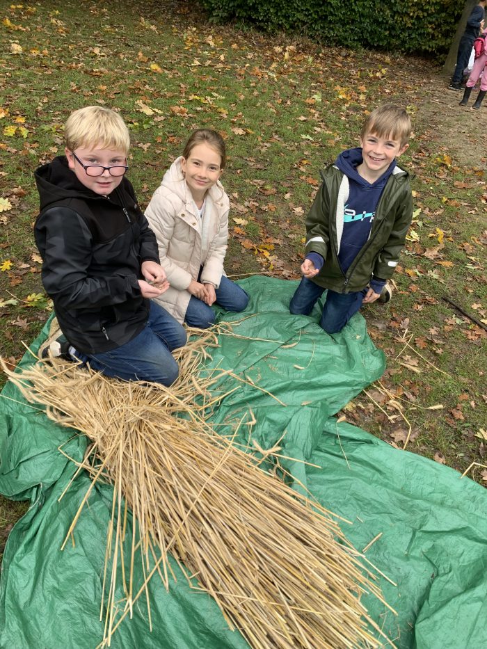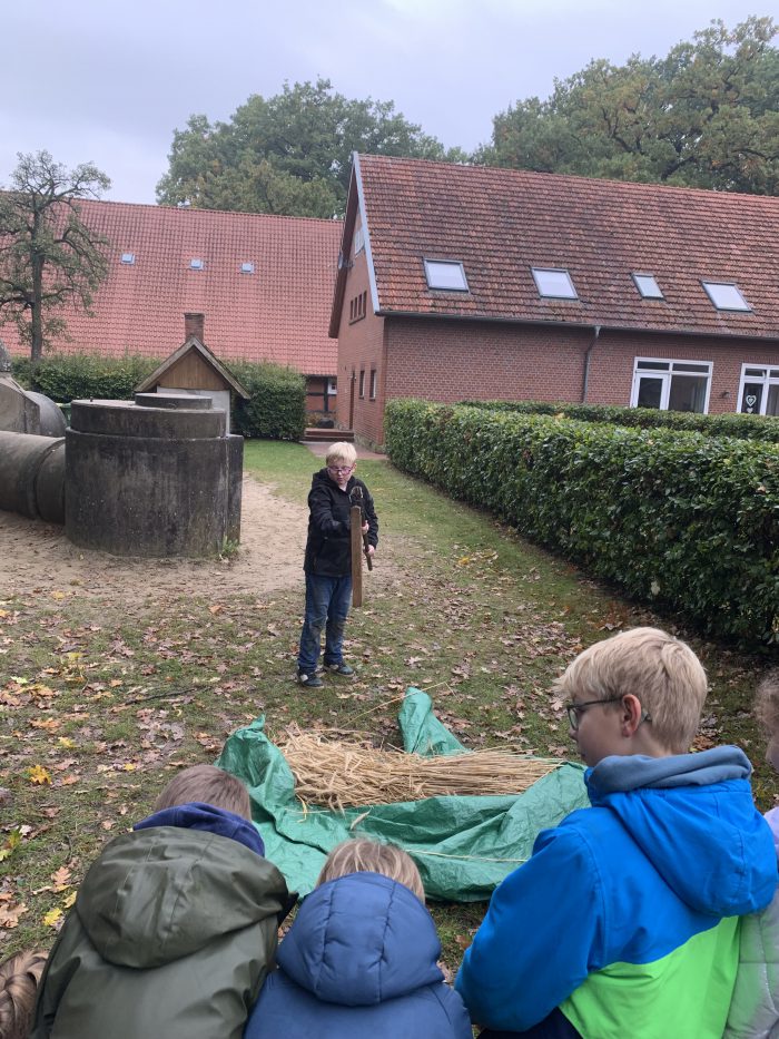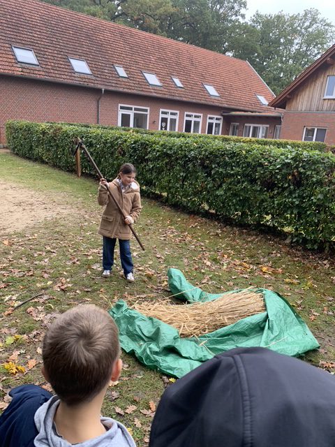 Kurz vor den Herbstferien besuchte die Klasse 3 die Bildungseinrichtung Kuhlhoff in Bippen. Passend zu ihrem Sachunterrichtsthema „Getreide“ lernten die Schülerinnen und Schüler vor Ort den Weg vom Korn zum Brot vertiefend kennen. Nachdem die Kinder einen kurzen theoretischen Einblick erhielten, durften sie selbst mit einem Dreschflegel Korn aus den Ähren dreschen und konnten so die frühere, harte Arbeit nachempfinden. Das erhaltene Korn mahlten sie mit kleinen Mühlen zu Mehl.