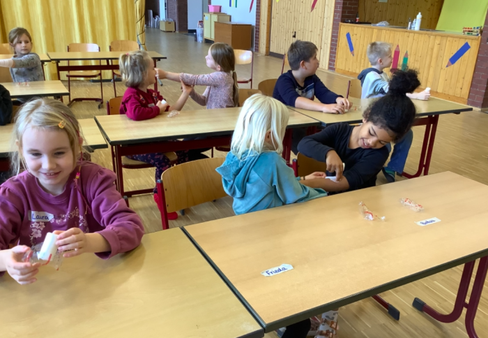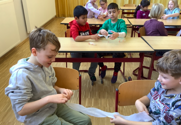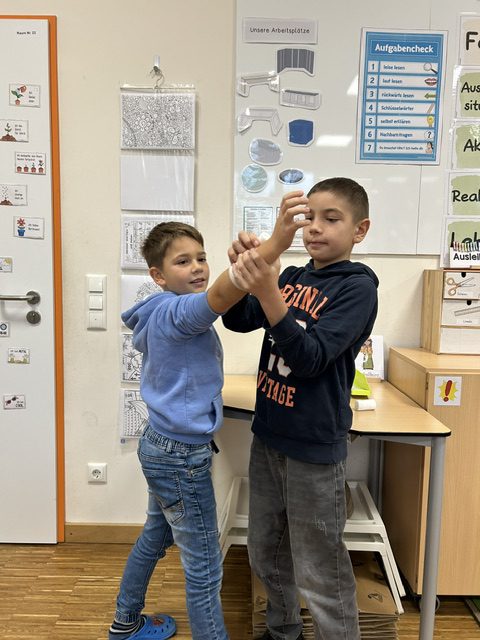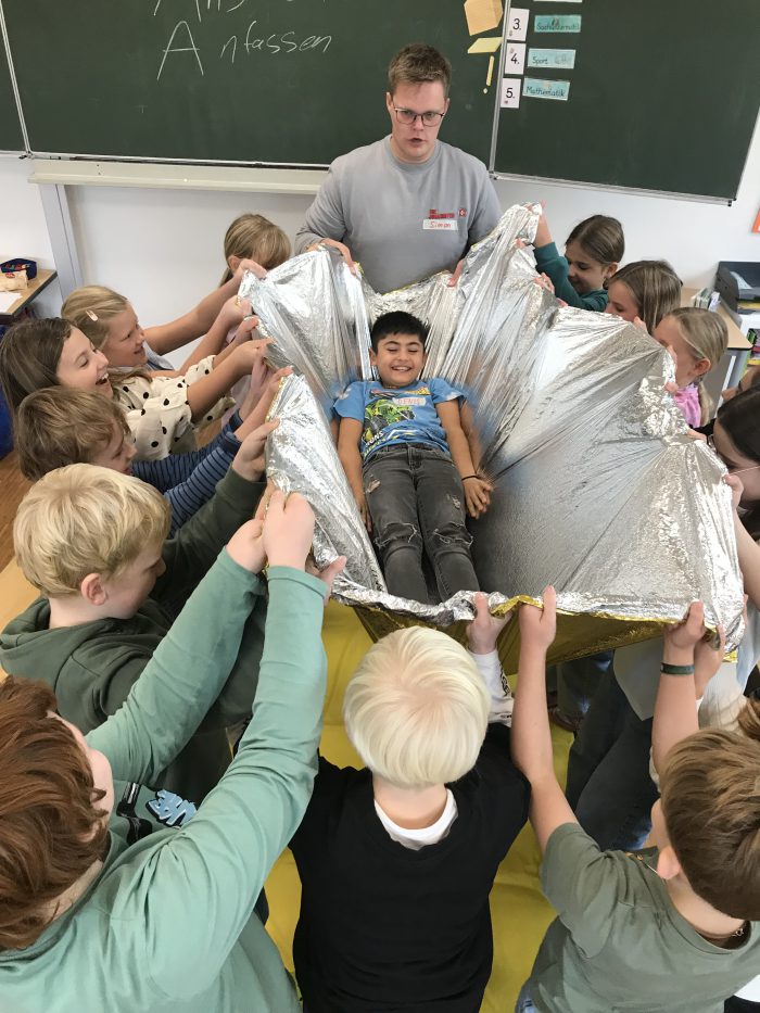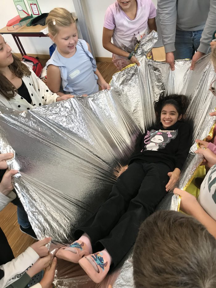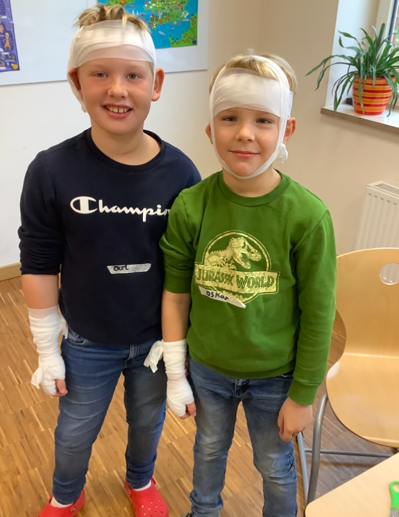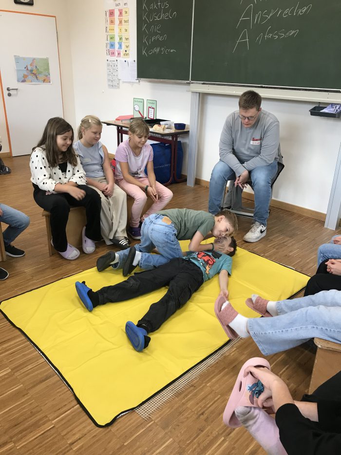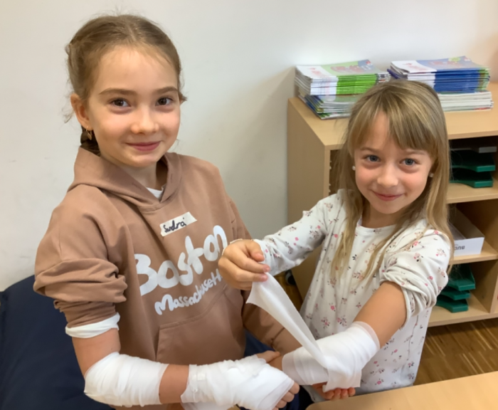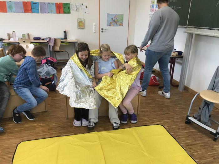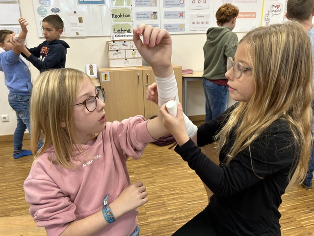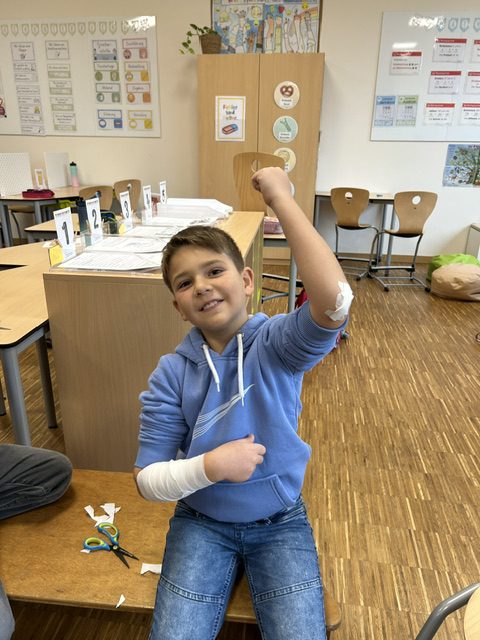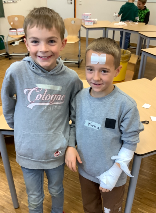 Gemeinsam wurde erprobt, wie ein Verband richtig angelegt wird und wie wir mit einfachen Schnitten alltagstaugliche Pflaster kleben können. Mithilfe einfacher Eselsbrücken können wir nun in Notfällen andere Personen in die stabile Seitenlage legen und den Notruf informieren.
