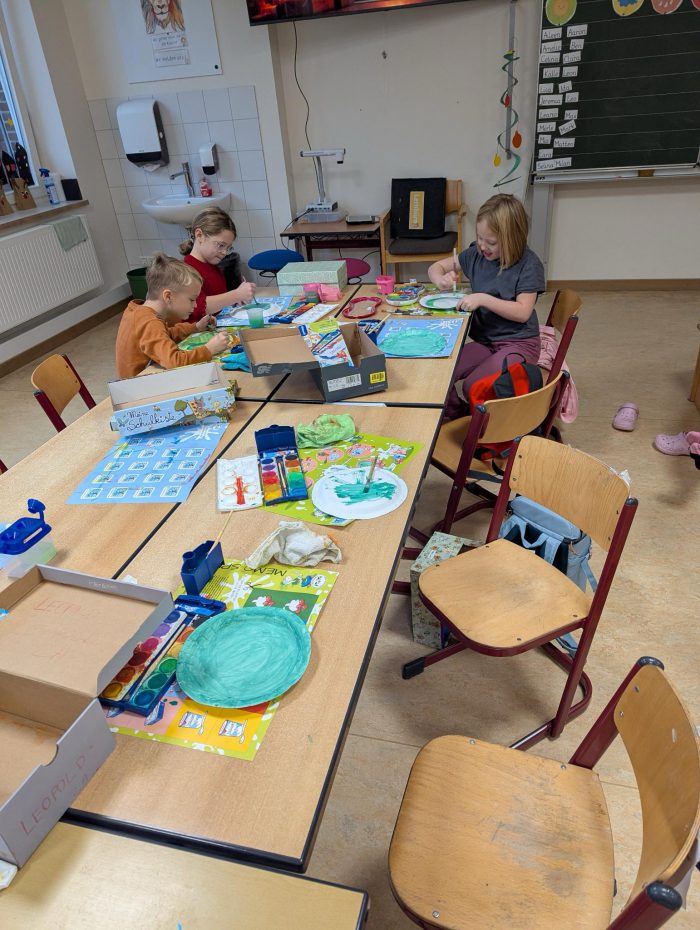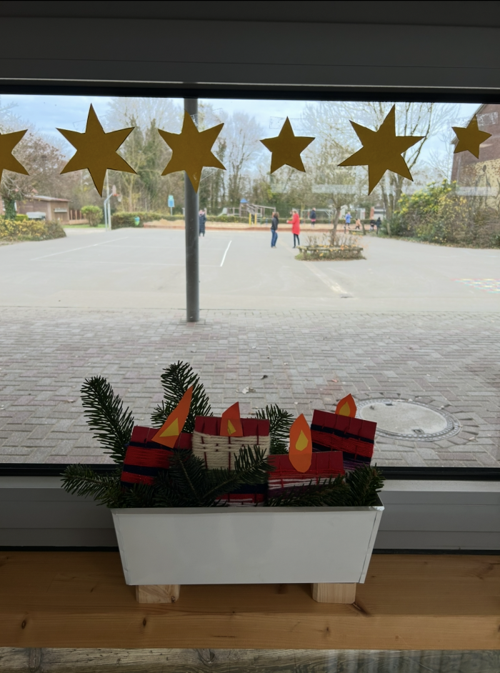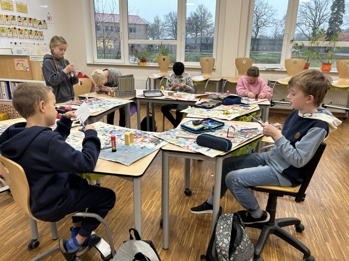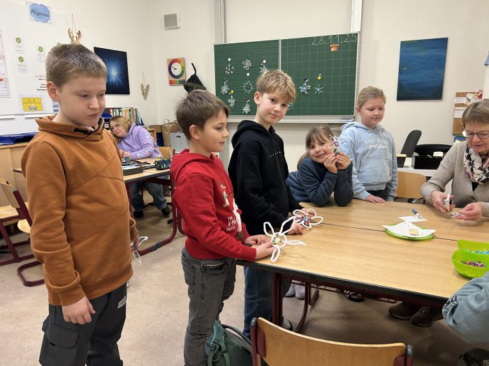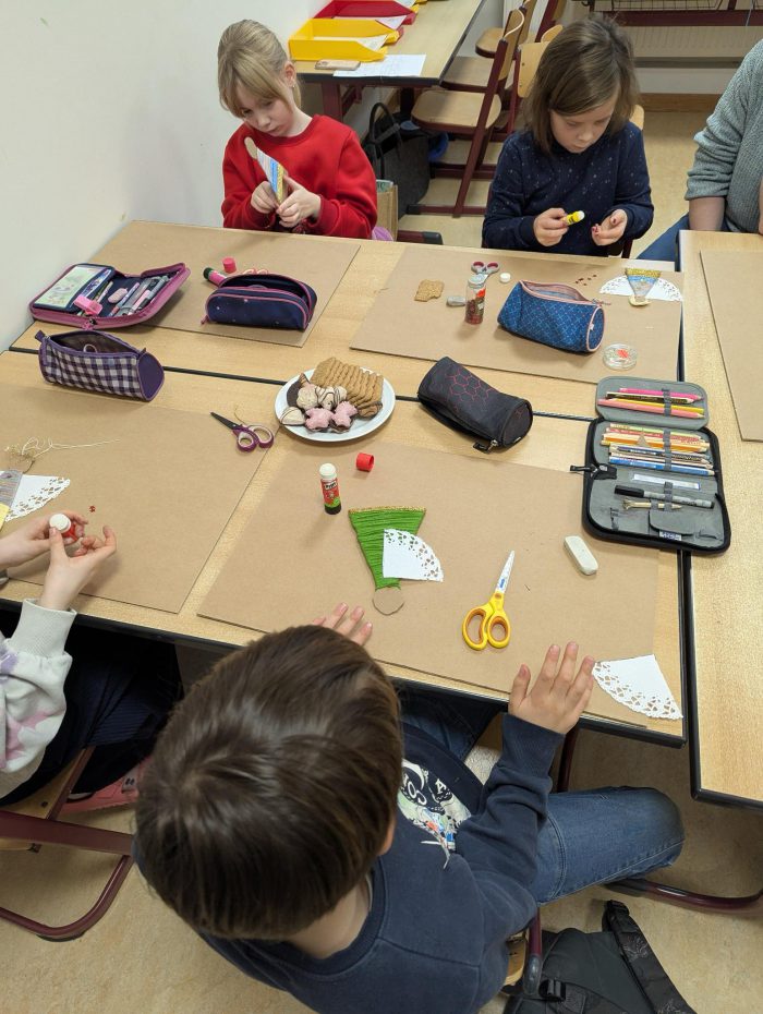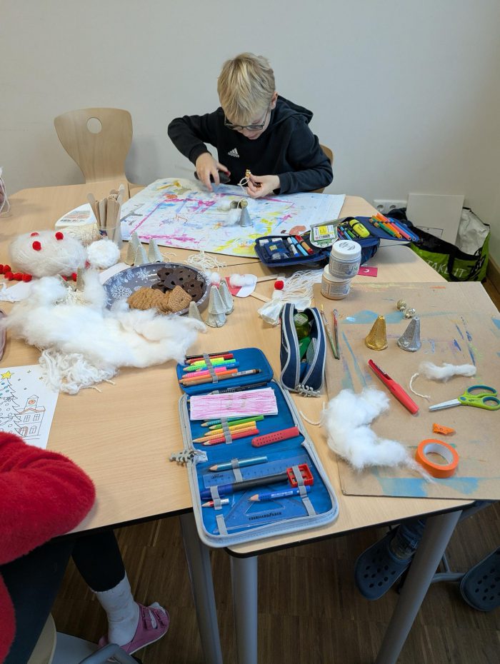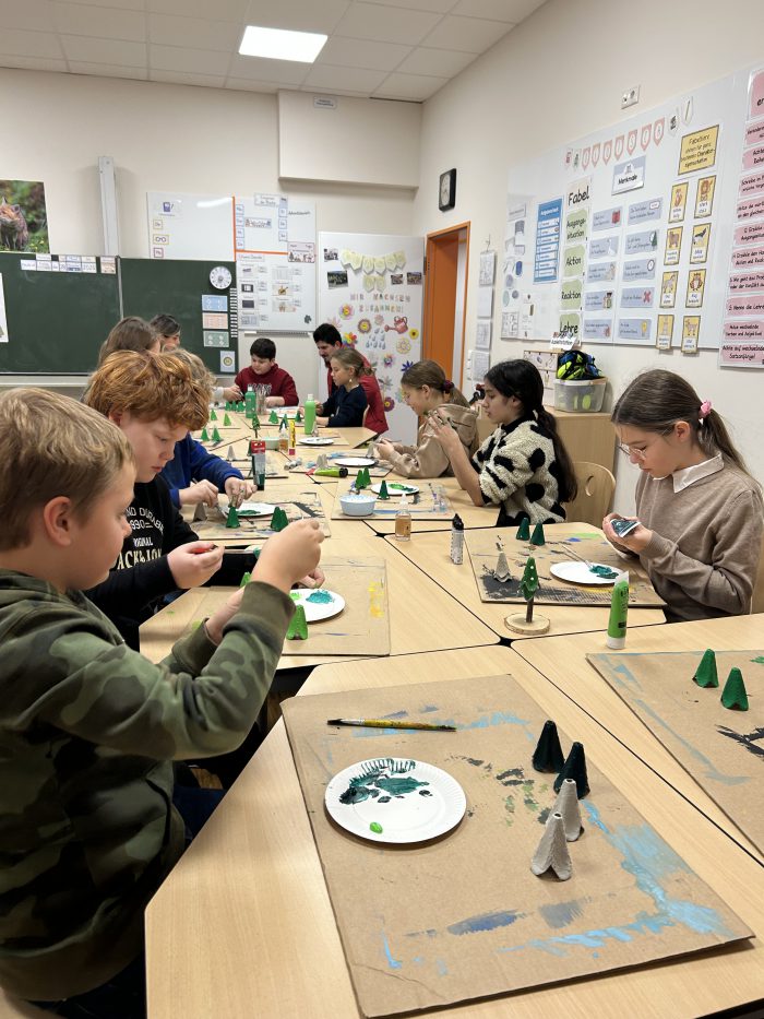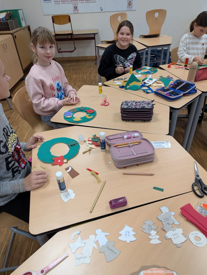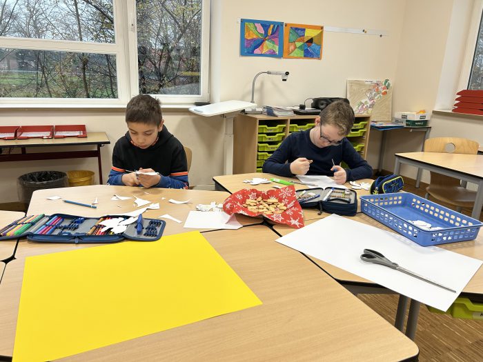 Ende November war es wieder soweit – den ganzen Vormittag wurde im Rahmen des diesjährigen Adventsbasteltags fleißig gemalt, geschnitten, gefaltet und geklebt. Bei gemütlichen Lichtern und fröhlicher Weihnachtsmusik entstanden so zahlreiche weihnachtliche Kunstwerke, die nun unsere ganze Schule schmücken.